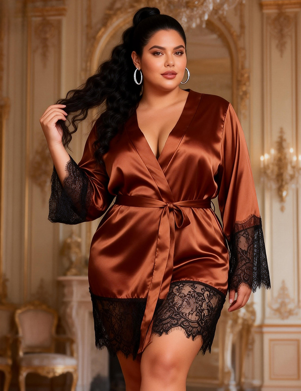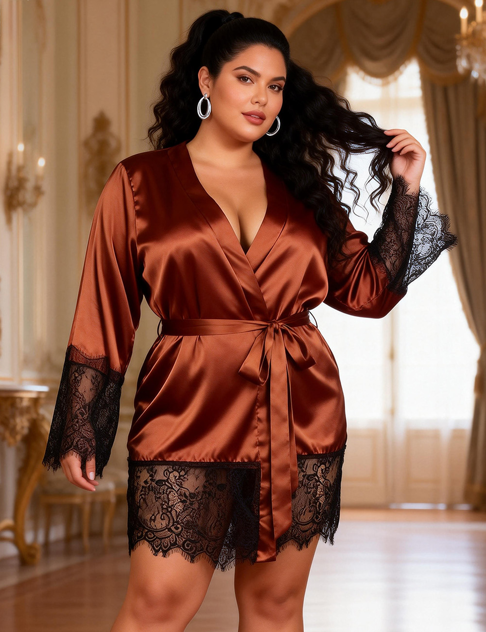 Elegant Plus Size Nightdress Silk Eyelash Lace Long Sleeves Sleepwear With G String