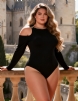 Black Sexy Round Neck Off-Shoulder Long Sleeve Form-Fitting Open-Crotch Bodysuit