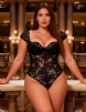 Black Lace Square-neck Short-sleeve Open-crotch Jumpsuit