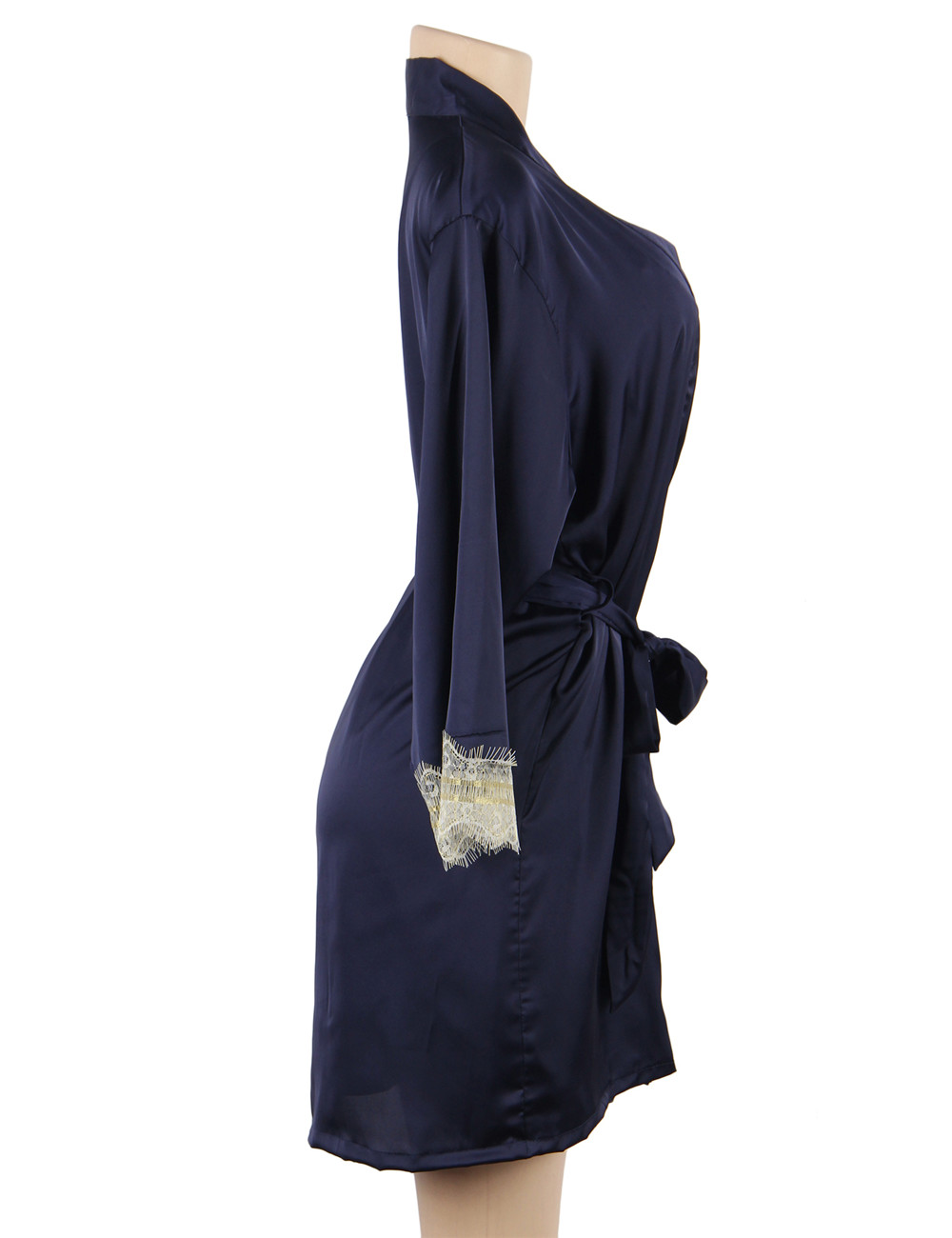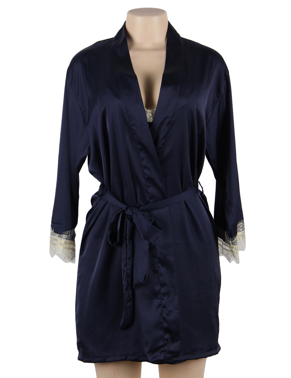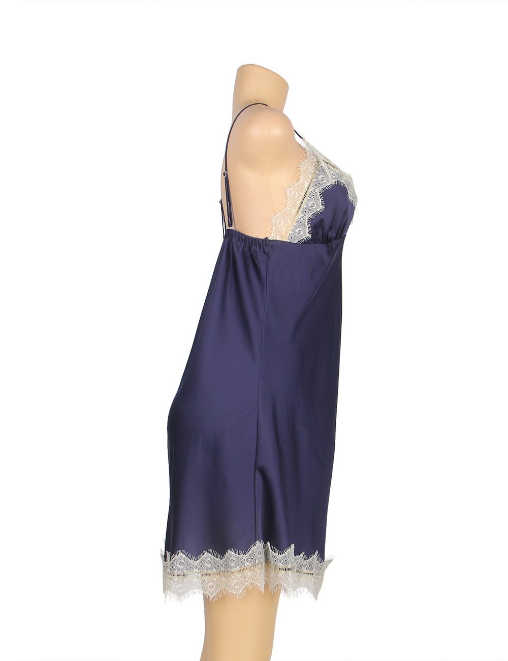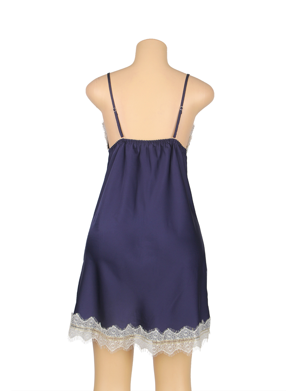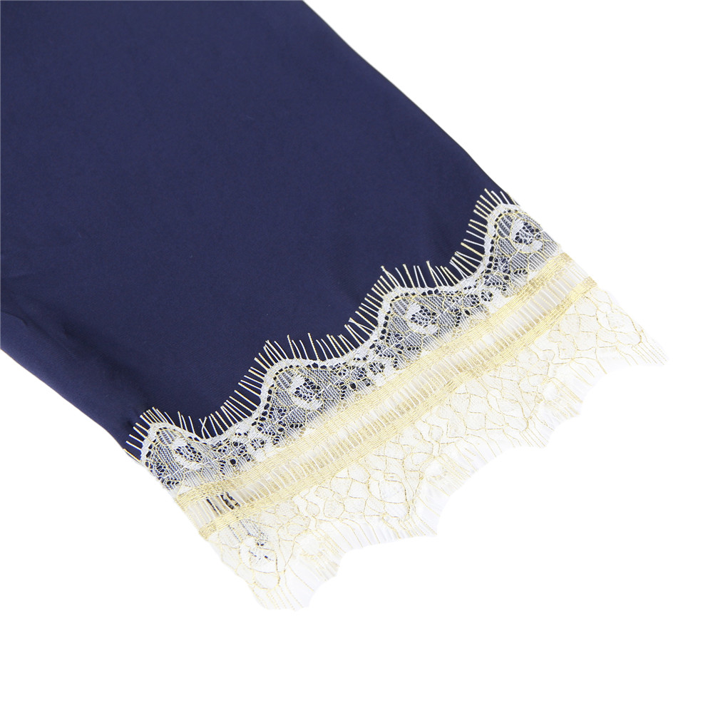 Dark Blue Silk Satin Lace Splice Sexy Women Two-piece Home Pajamas