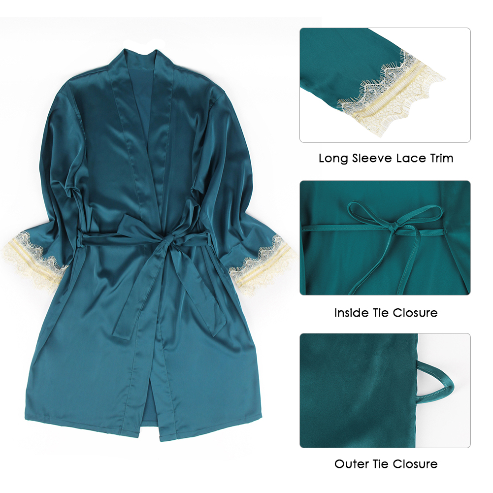 The set comprises a long-sleeved robe and a matching camisole, both of which can be worn separately or together depending on your preferences. Additionally, it comes with an imitation silk waist belt that can be used to accessorize either piece.